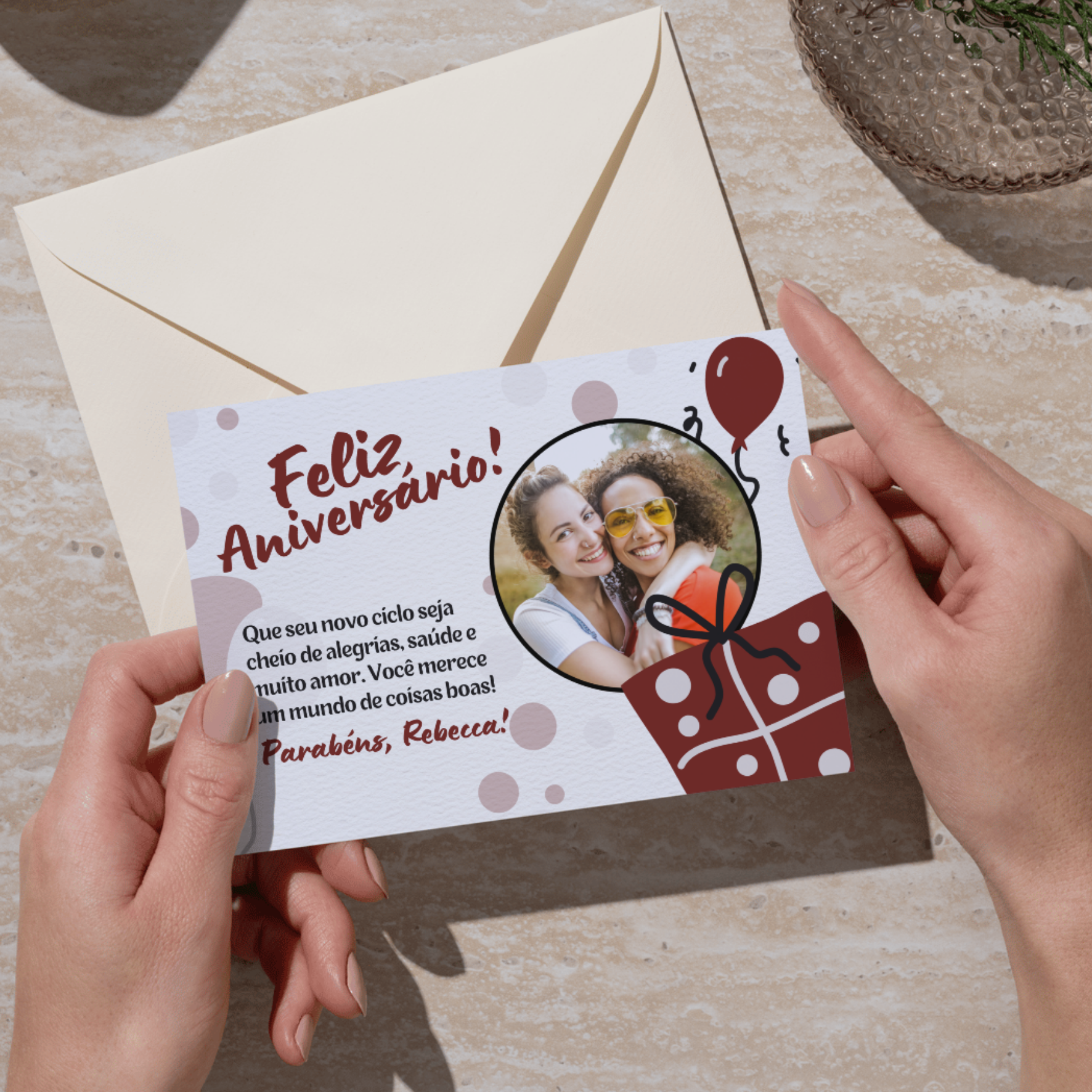 O Cartão de Aniversário personalizado é a forma perfeita de complementar seu presente com emoção e significado. Mais do que uma mensagem, ele traz uma lembrança única através de uma foto especial e palavras que tornam a data ainda mais inesquecível.