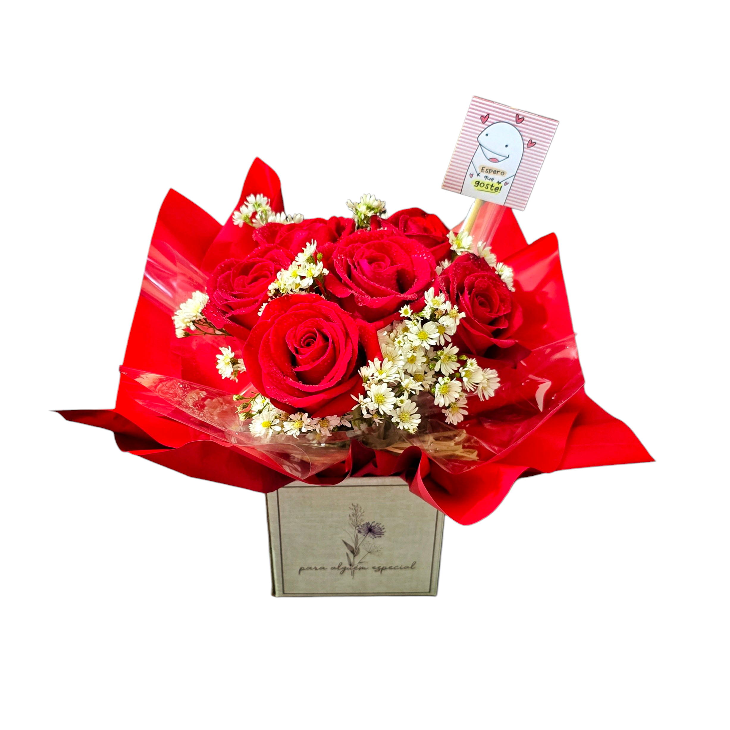 • 6 Rosas Nacionais Vermelhas: Símbolo de amor, carinho e admiração, dispostas de forma harmoniosa em um arranjo compacto.