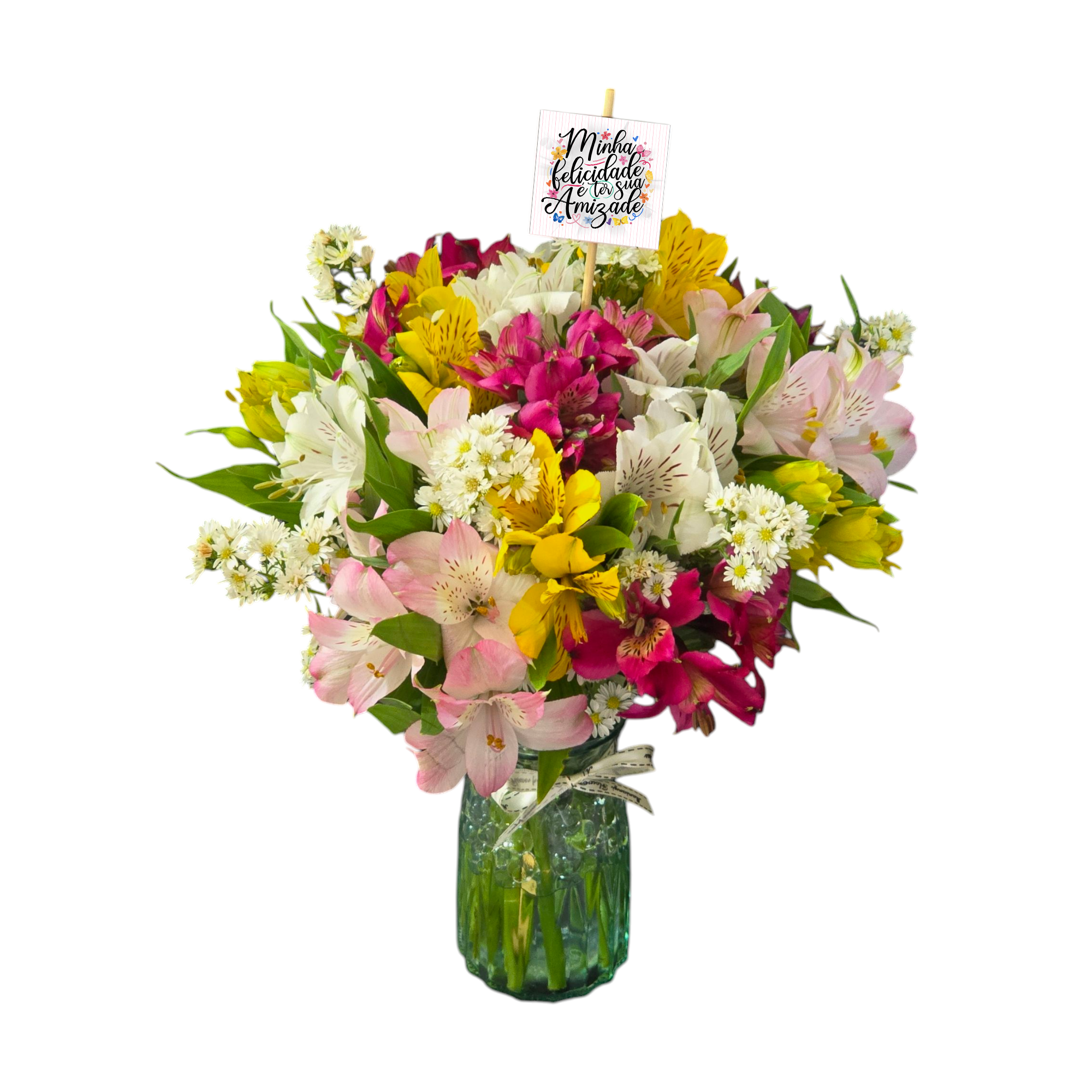 💬 Observação Importante: Por ser um arranjo com flores da estação, as cores das astromélias variam semanalmente conforme a disponibilidade, mas garantimos sempre um mix vibrante e harmonioso. O modelo do vaso de vidro e a arte da plaquinha (dentro do tema escolhido) também podem variar. Garantimos a mesma qualidade e capricho em cada montagem.