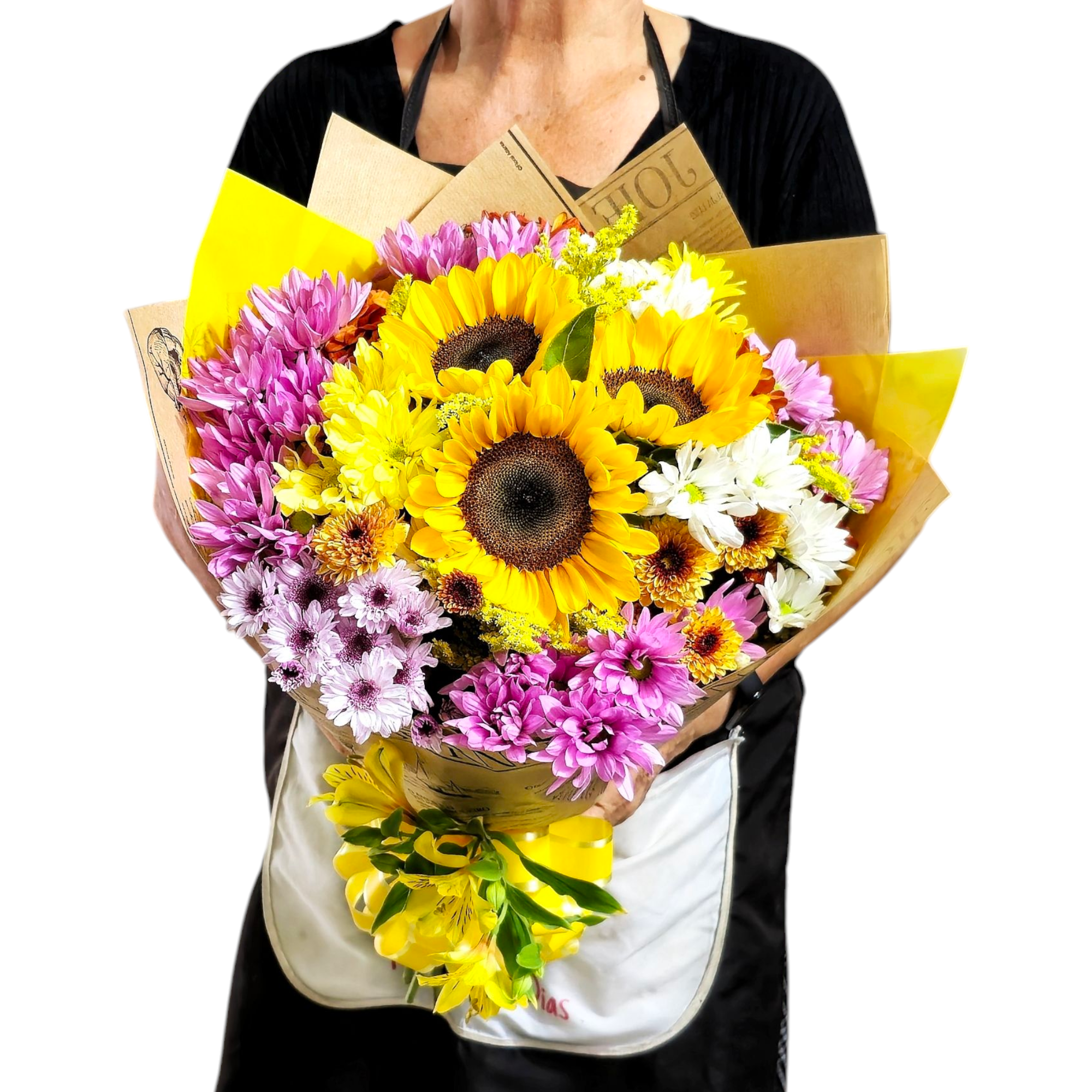 💬 Observação Importante: Este é um buquê autoral e sazonal. O tamanho dos girassóis pode variar conforme a estação (maiores ou menores), e a composição exata das flores do campo, assim como suas cores, podem variar significativamente conforme a melhor disponibilidade do dia, mas sempre mantendo a harmonia e a vibração do buquê.