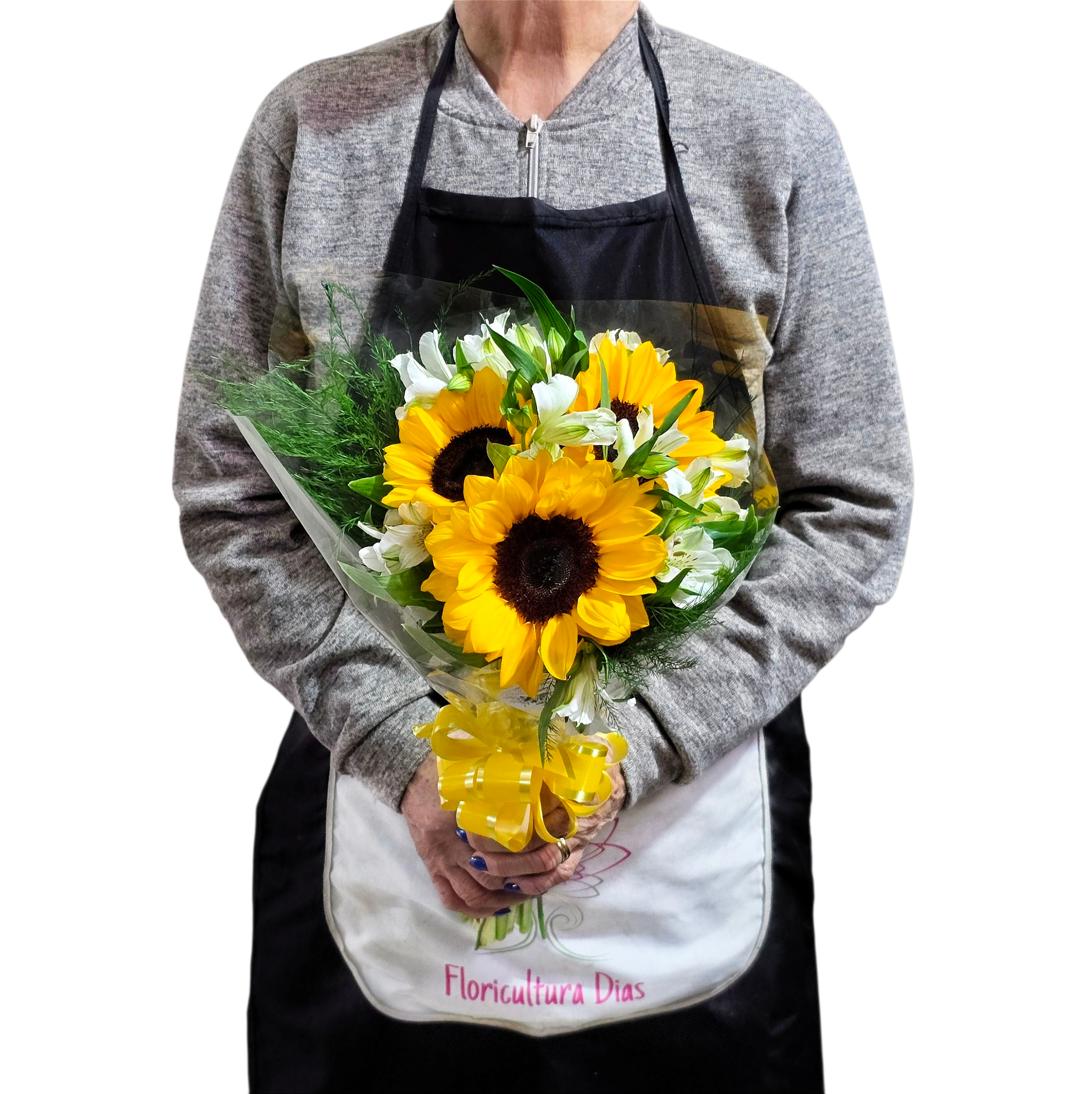 💬 Observação Importante: Por ser um produto natural, a tonalidade e o tamanho dos girassóis e das astromélias podem variar. As flores complementares podem ser substituídas por outras de igual beleza, conforme a disponibilidade do dia. Garantimos sempre a harmonia, a qualidade e o capricho na montagem.
