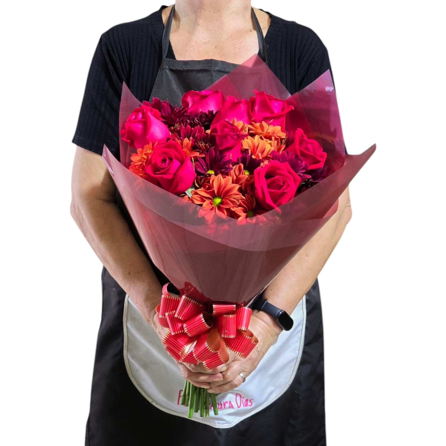 💬 Observação Importante: Por ser um produto natural, as rosas podem ter variações no tamanho e no estágio de abertura (mais abertas ou fechadas). O tipo e a tonalidade exata das flores do campo podem variar, mas sempre mantendo a paleta de cores quentes (vermelho/laranja/vinho) e a estética apaixonante do buquê.