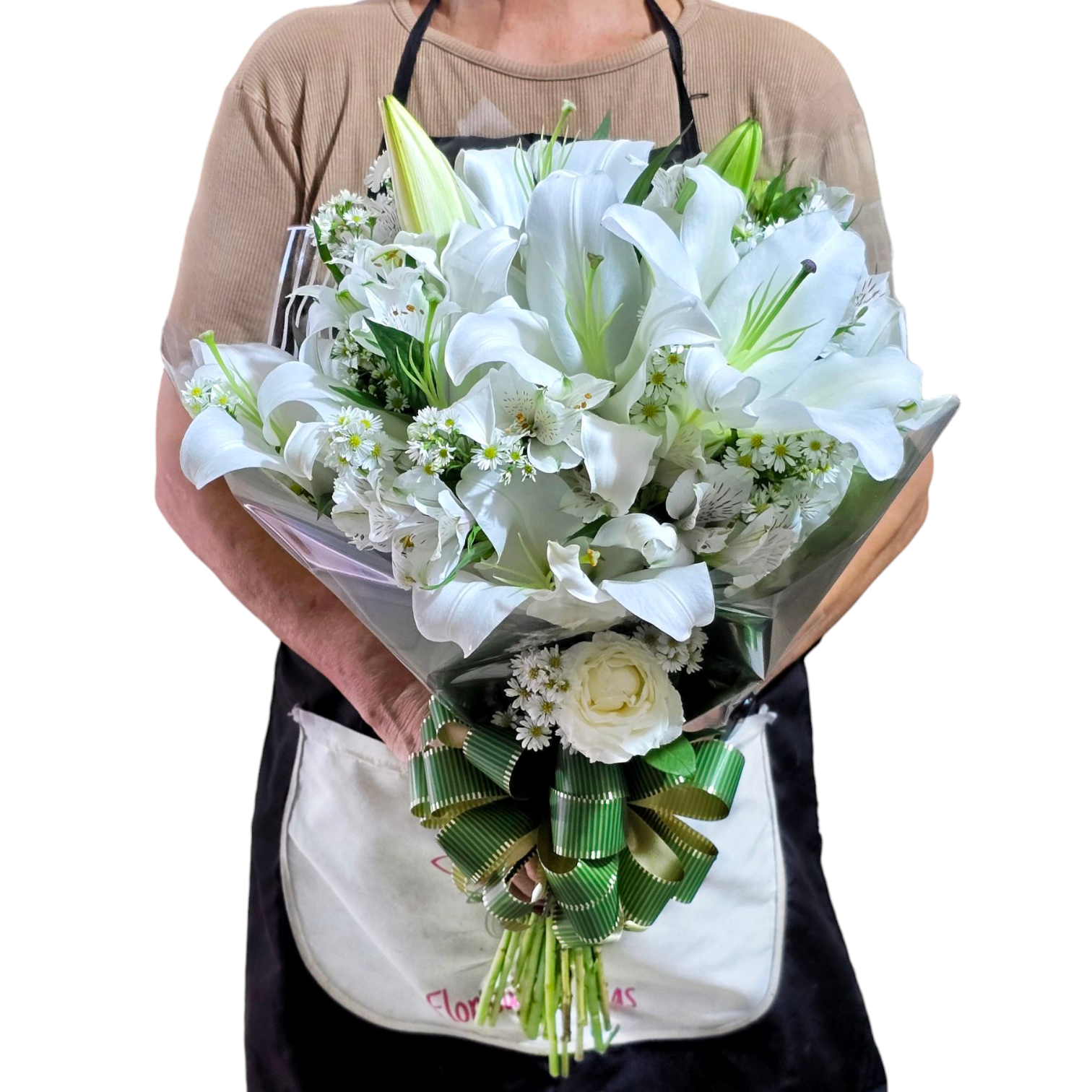 💬 Observação Importante: Por se tratar de flores naturais, a tonalidade do branco e o estágio de abertura dos lírios e astromélias podem variar. O tipo da flor complementar também pode mudar. Garantimos sempre a harmonia, a qualidade e a elegância do buquê.