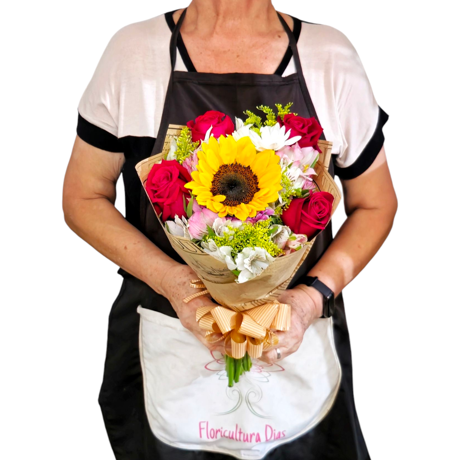 💬 Observação Importante: Por ser um produto natural, as rosas podem ter variações no tamanho e no estágio de abertura (mais abertas ou fechadas), e o girassol também pode variar de tamanho conforme a estação. As cores e tipos das flores do campo e astromélias podem variar. Garantimos sempre a harmonia, a qualidade e a beleza do seu buquê.