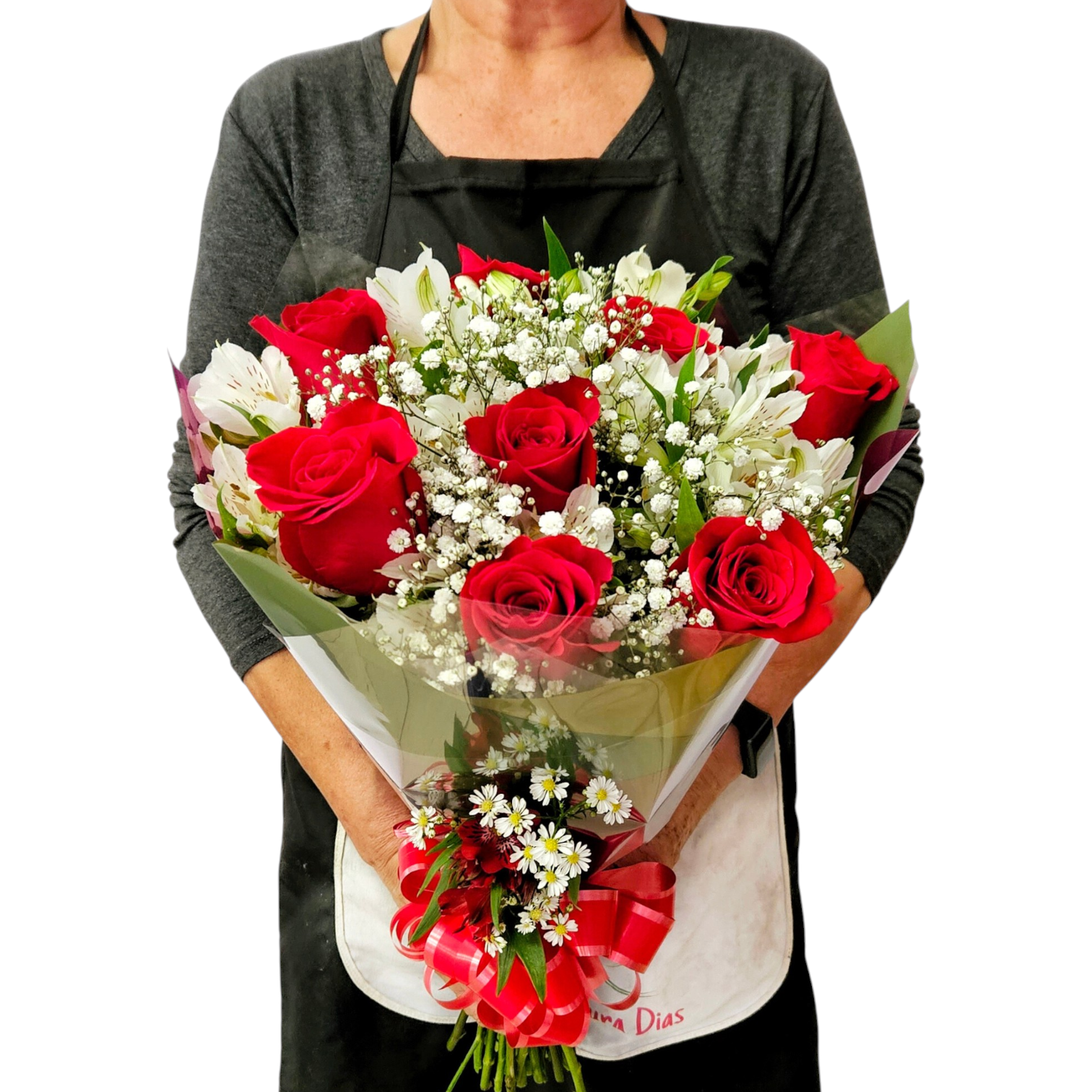 Para quem ama a paixão das rosas, mas busca um toque de sofisticação e modernidade, o Buquê Pacaembu é a escolha perfeita em São Paulo. Ele combina a intensidade de 9 rosas vermelhas com a beleza delicada das astromélias claras, criando um contraste visual deslumbrante e cheio de significado. Envolto em papéis coloridos que realçam sua vibração, é um presente que reinventa o clássico e encanta pelo seu charme único.