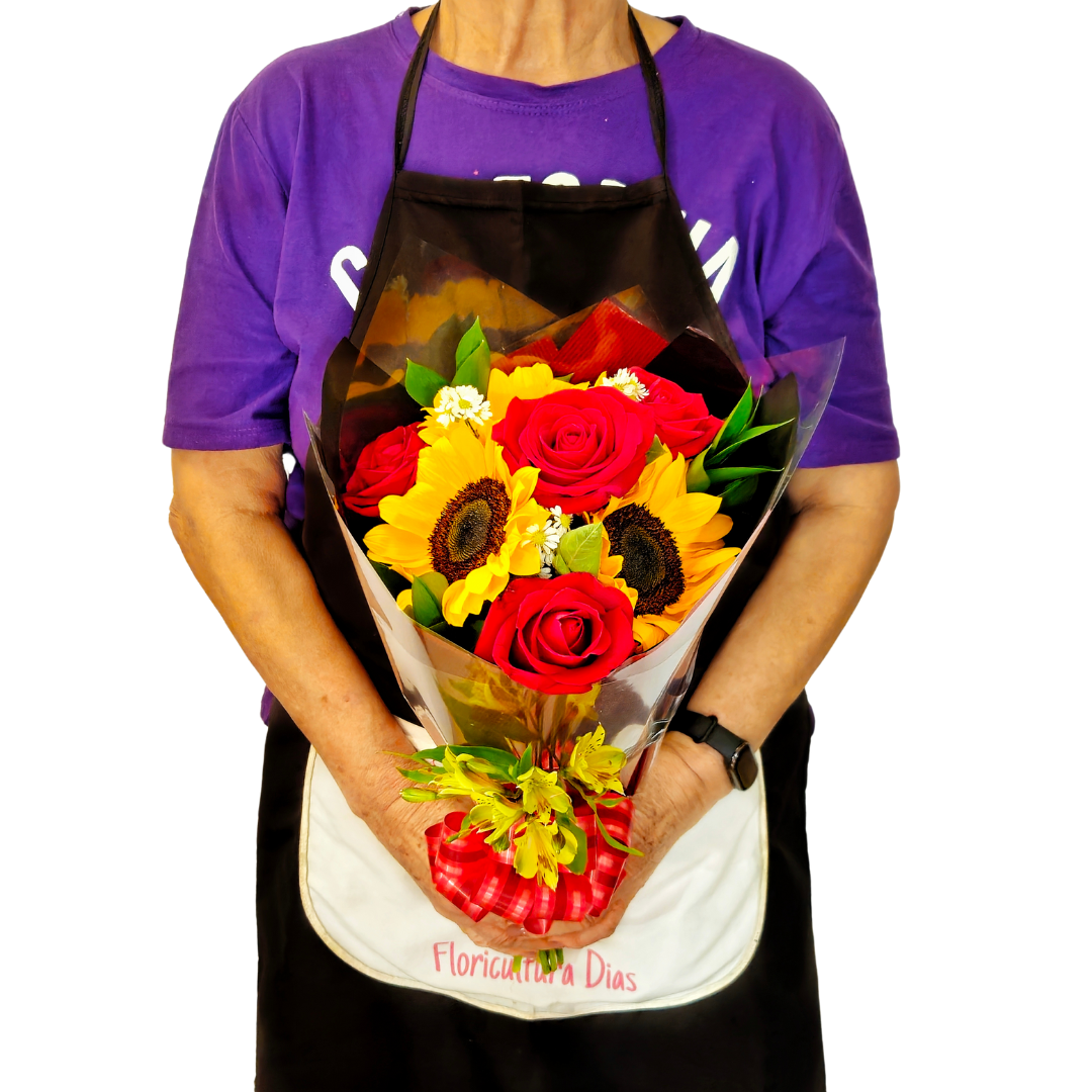 💬 Observação Importante: Por ser um produto natural, as rosas podem ter variações no tamanho e no estágio de abertura (mais abertas ou fechadas), e os girassóis também podem variar de tamanho conforme a estação. As cores e tipos das flores complementares também podem variar. Garantimos sempre a harmonia, a qualidade e a beleza do seu buquê.