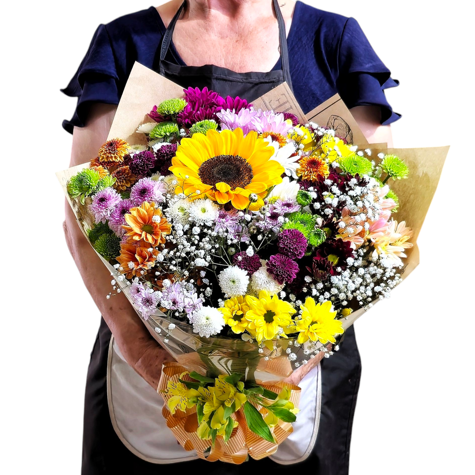 💬 Observação Importante: Este é um buquê autoral e sazonal. O tamanho do girassol pode variar conforme a estação (maiores ou menores), e a composição exata das flores do campo, assim como suas cores, podem variar significativamente conforme a melhor disponibilidade do dia, mas sempre mantendo a harmonia e a vibração do buquê.