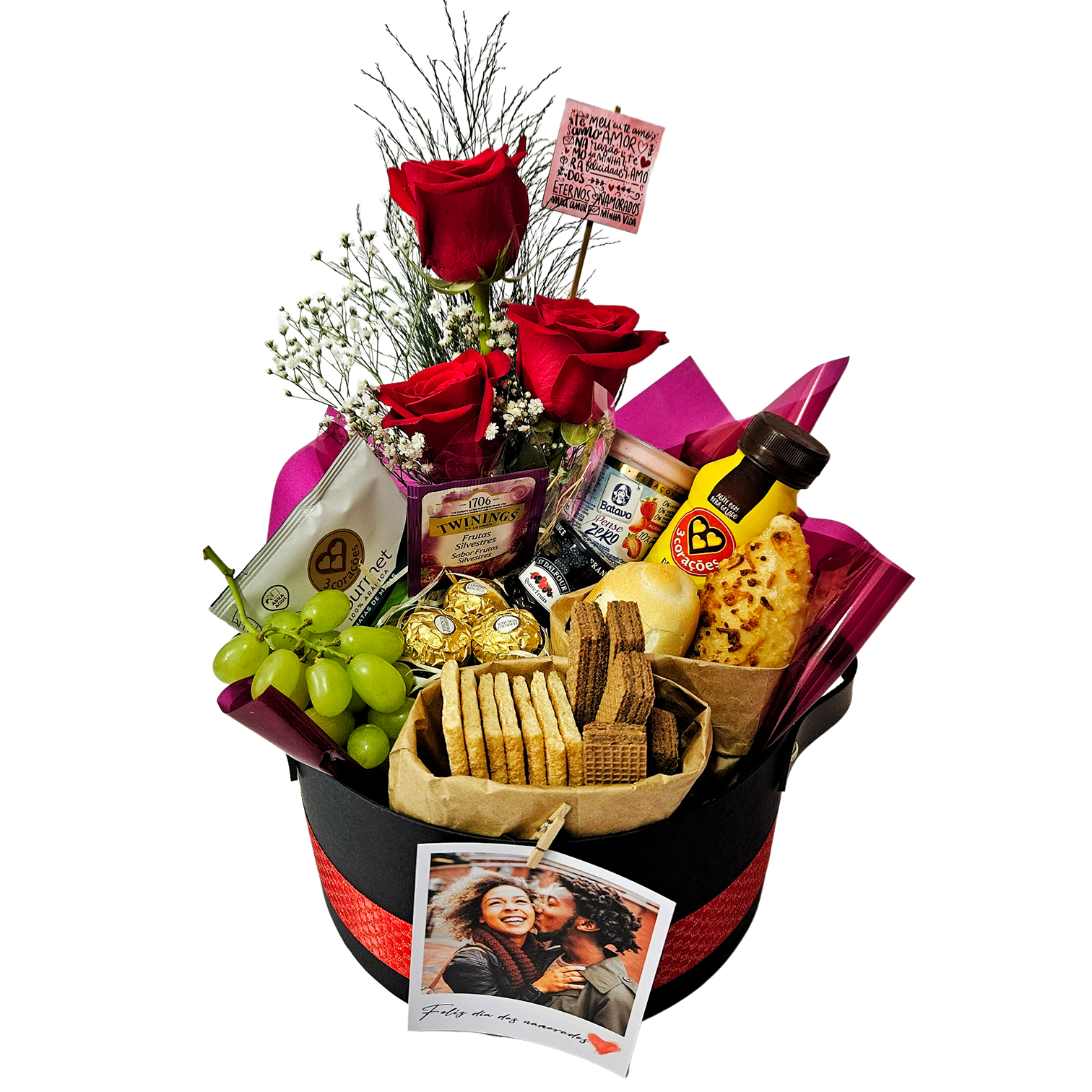 A cesta é cuidadosamente montada em um box cartonado preto, com alças de couro que adicionam um toque de elegância. Decorada com uma fita de cetim vermelha, ela transmite todo o amor e cuidado presente nessa ocasião especial.