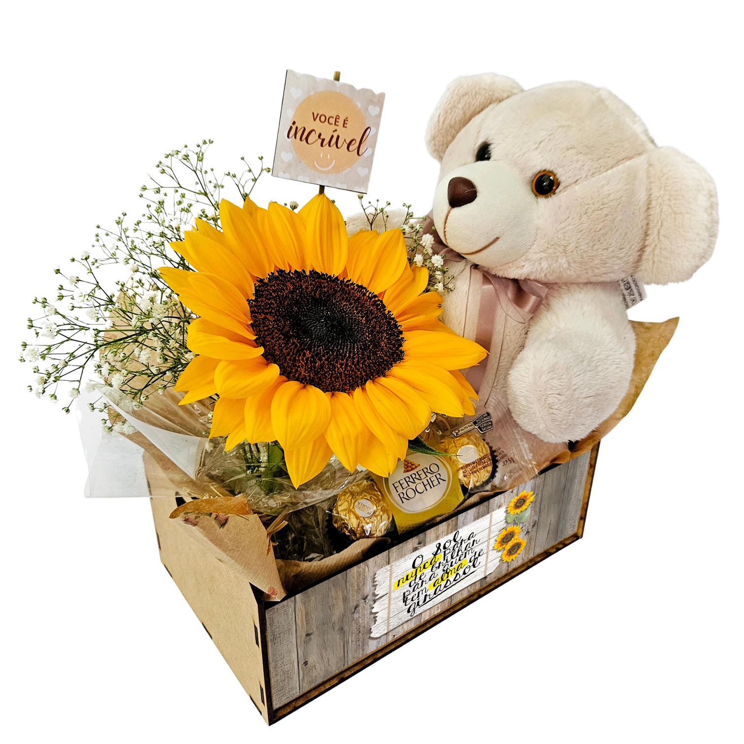 💬 Observação Importante: A flor principal do arranjo (girassol, rosa ou astromélias) está sujeita à disponibilidade. Por serem produtos naturais, as rosas podem ter variações de tamanho e abertura, e os girassóis podem variar de tamanho conforme a estação. O modelo do urso de pelúcia, o design do caixote e a arte da plaquinha também podem variar. Garantimos sempre a qualidade e o capricho do seu kit.