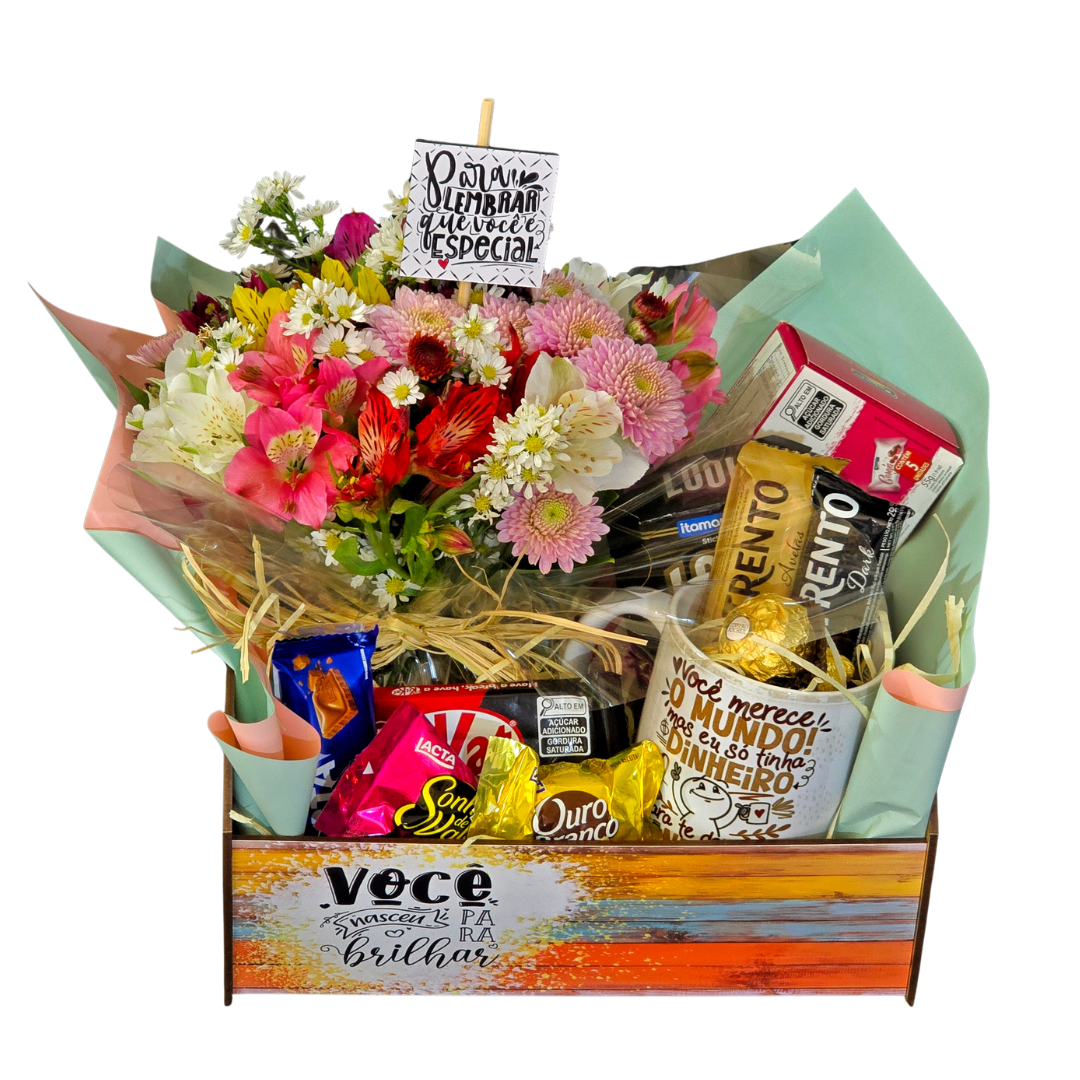 💬 Observação Importante: Por ser um produto com flores da estação, as cores das astromélias podem variar conforme a disponibilidade. A arte da caneca, os tipos de chocolates sortidos (exceto Ferrero Rocher) e o design do caixote também podem variar. Garantimos sempre a qualidade e o charme do seu kit.