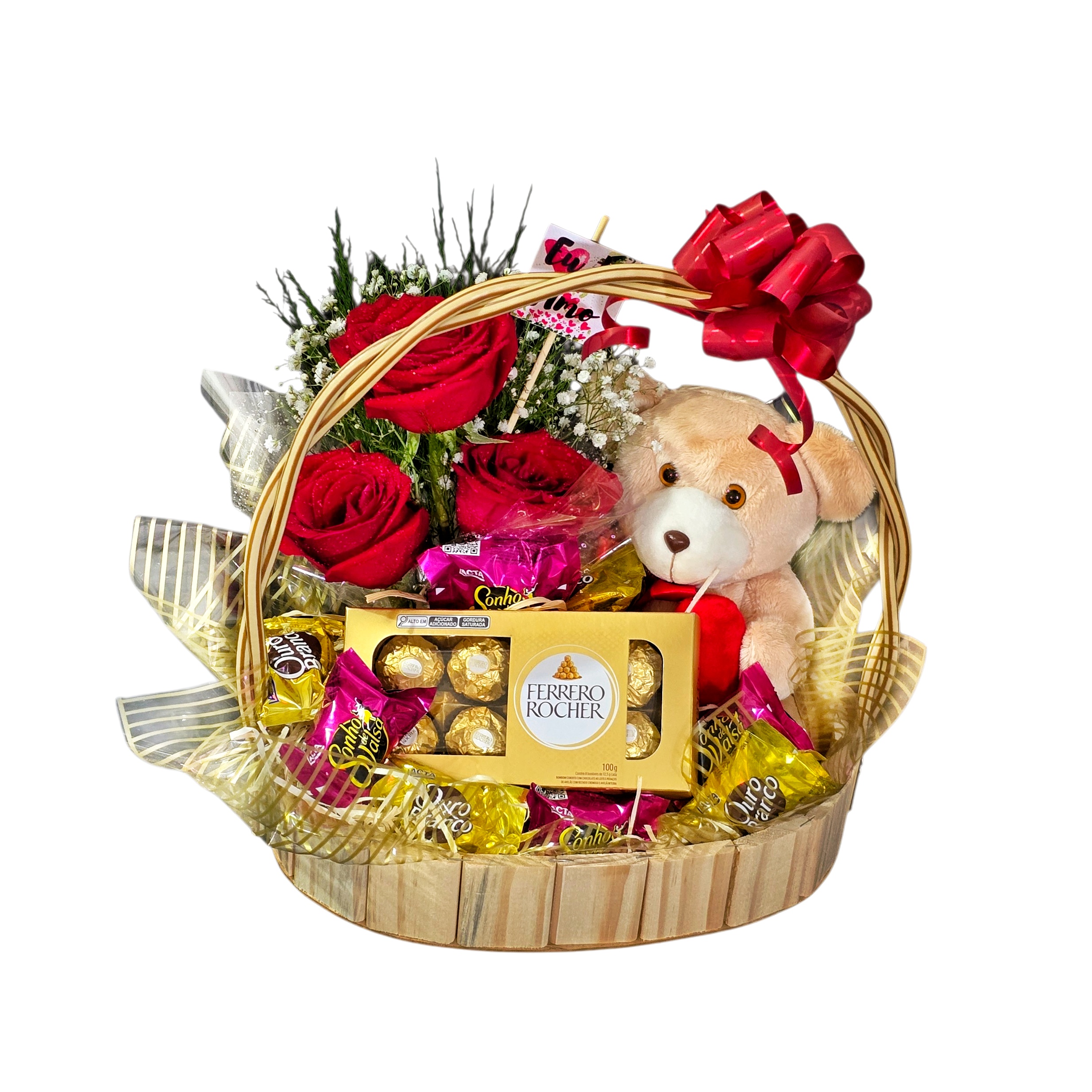 • Bombons Tradicionais: Bombons Sonho de Valsa e Ouro Branco, espalhados pela cesta para criar um visual abundante e envolvente.